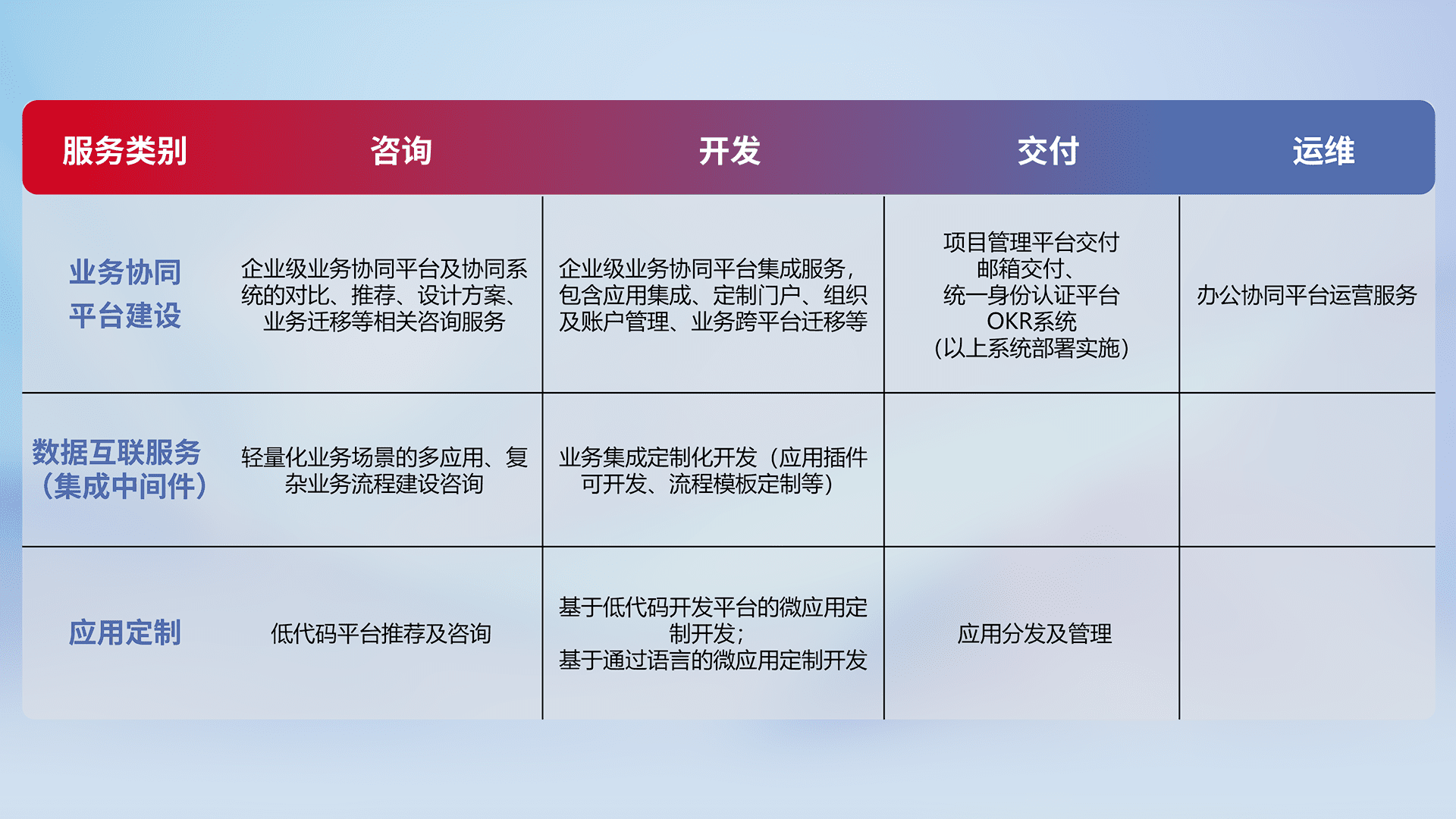 针对钉钉、、、、企微、、IDaas等平台级产品提供产品的规划、、、、方案、、交付、、、、定制化开发等服务,,实现如统一协同办公、、、、智能客户服务、、、混合会议管理、、、、智能数据查询、、等业务场景,,,,实现数字化转型。。。。