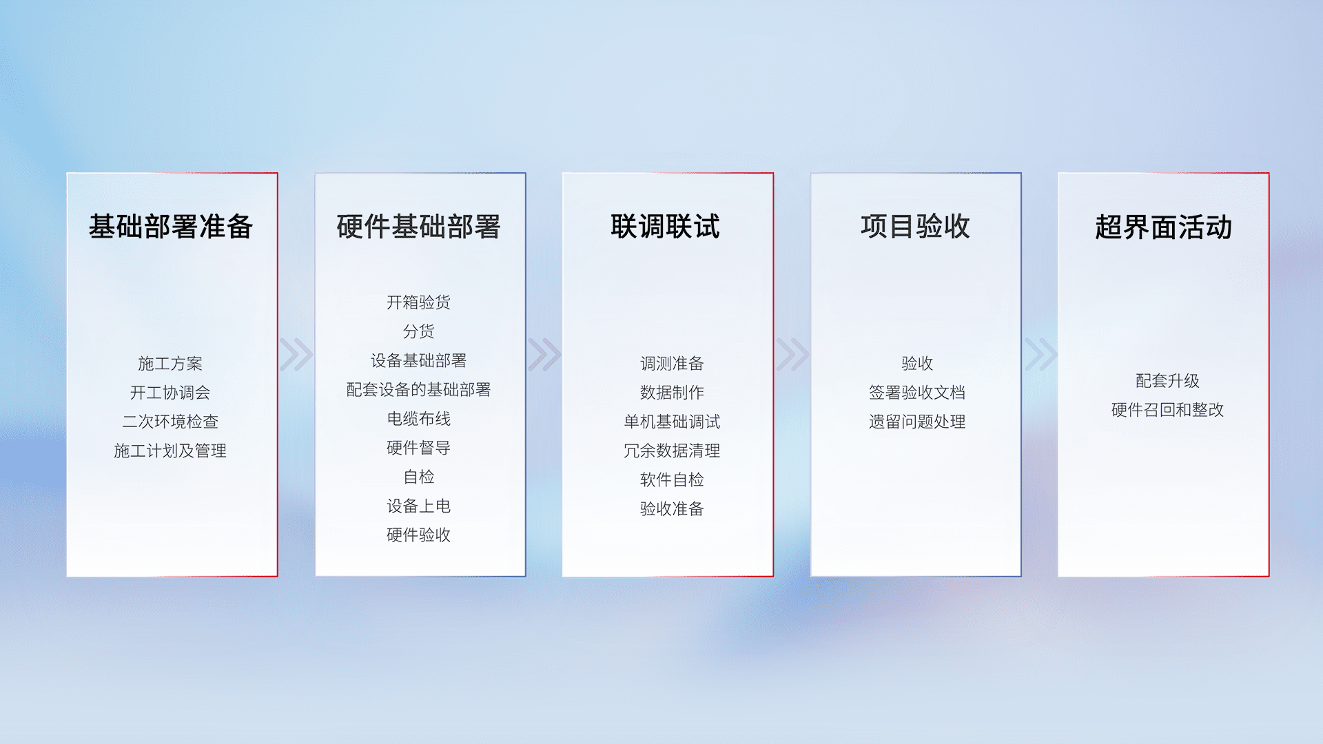 从基础部署准备、、硬件基础部署、、联调联试、、、、项目验收、、越界面活动的全过程可追溯,,保证施工质量和进度。。